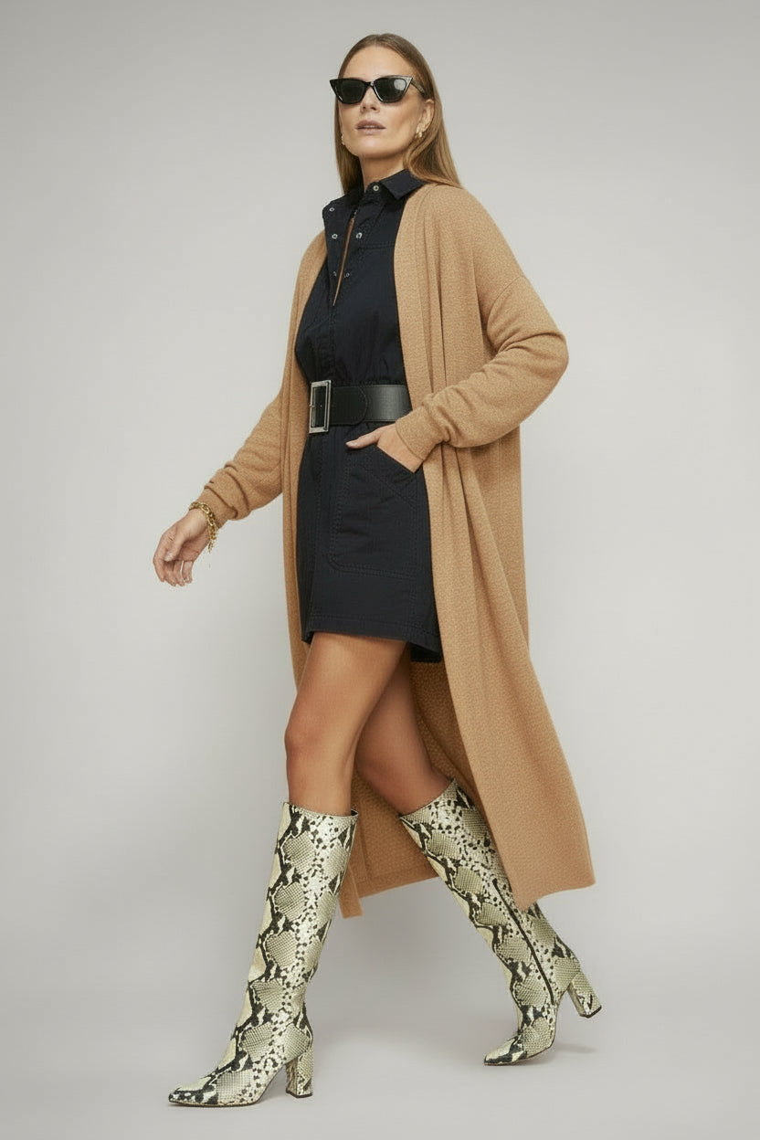 Styled with knee-high boots, a waist-defining belt, and your favorite long cardigan, this dress becomes a full blown winter city uniform — modern, confident, and timeless. And yes, she has pockets, because the AMARA woman deserves both beauty and practicality.