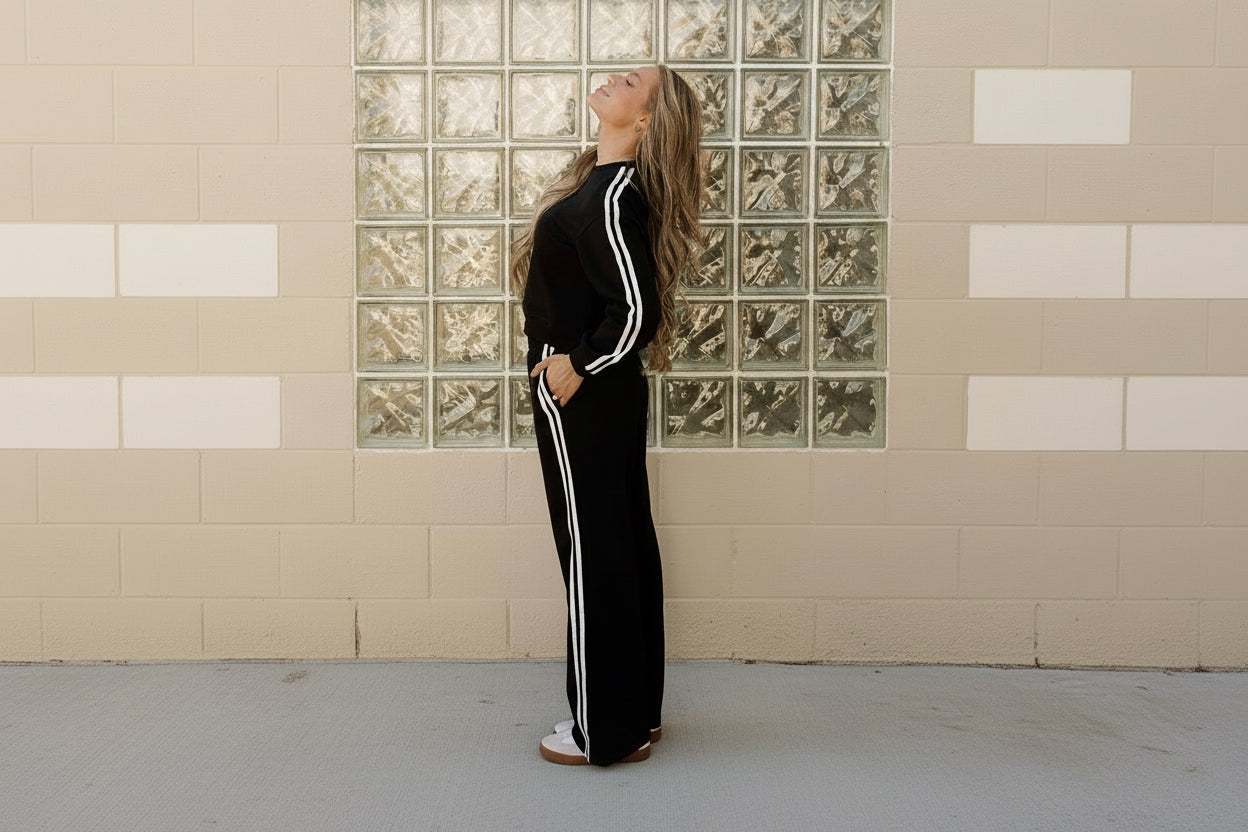 Varsity Athleisure Set - Black | Pullover | Wide Leg Pants