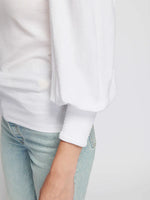 The ease of a comfortable, cotton tee meets the look of a fancy blouse. An exaggerated shoulder, volume in the 3/4 length sleeve, and smocking around the cuff create a delightfully feminine look. It's our best seller for a reason. This one comes in White or Black.
