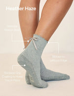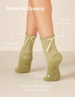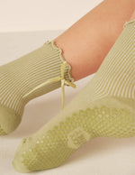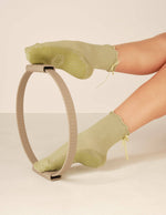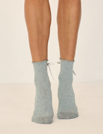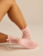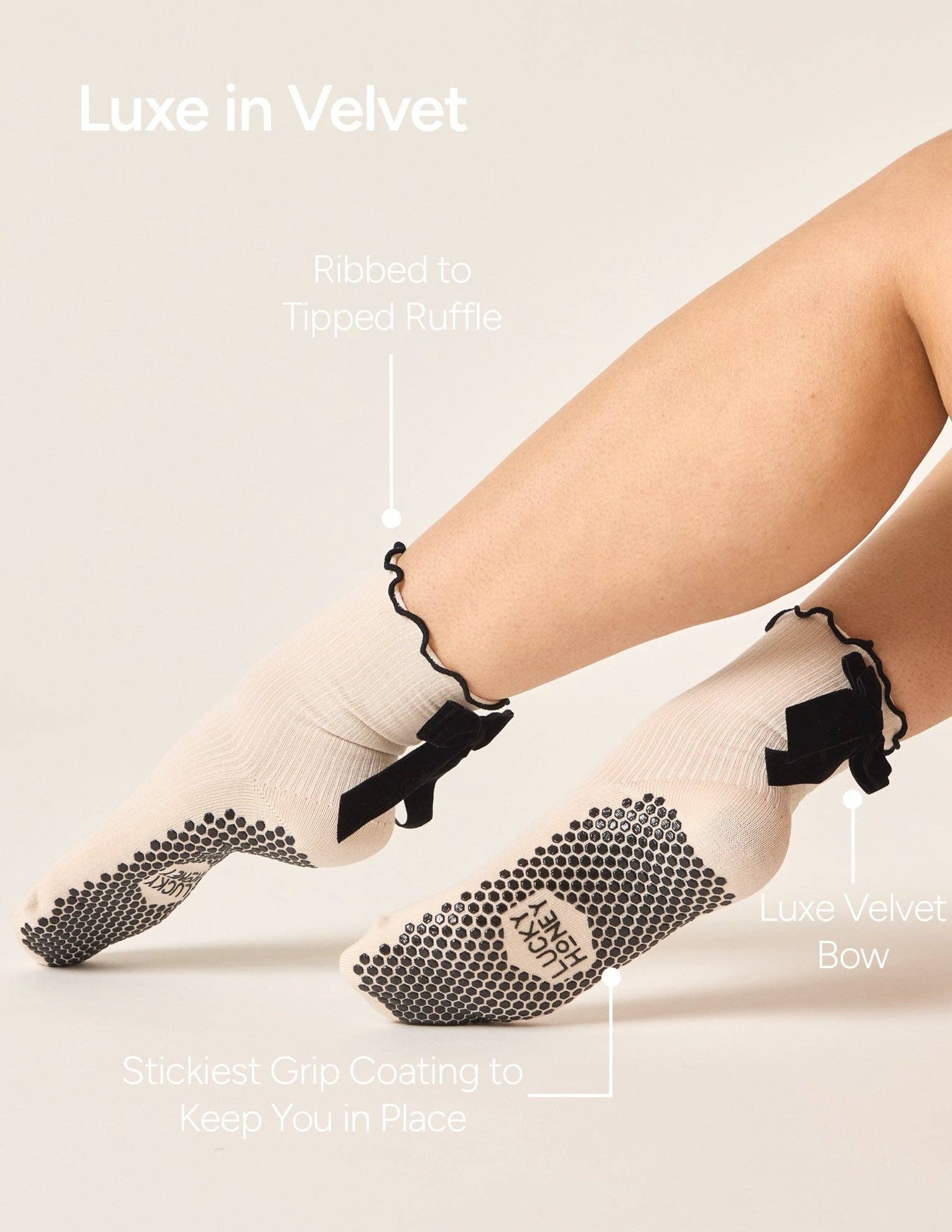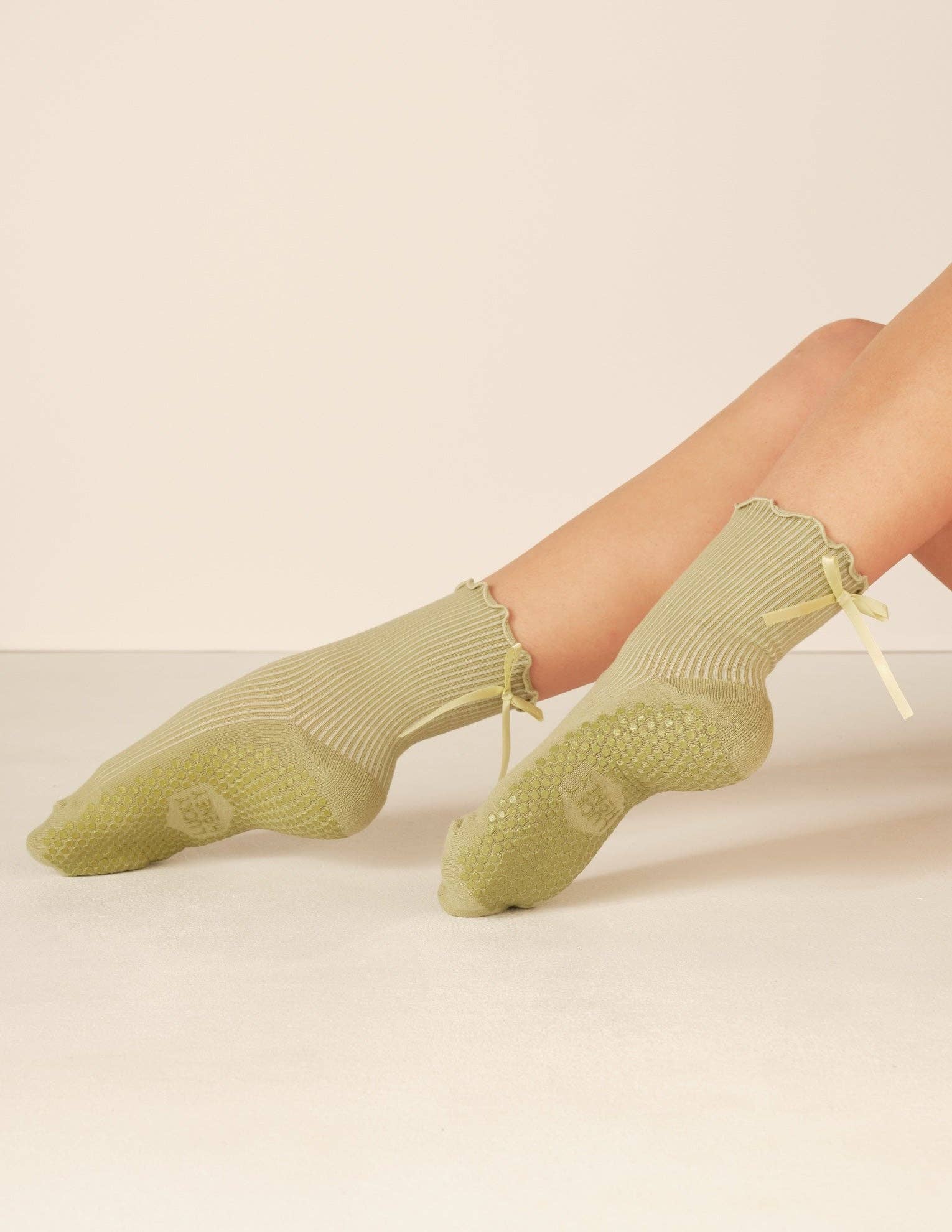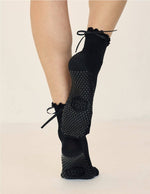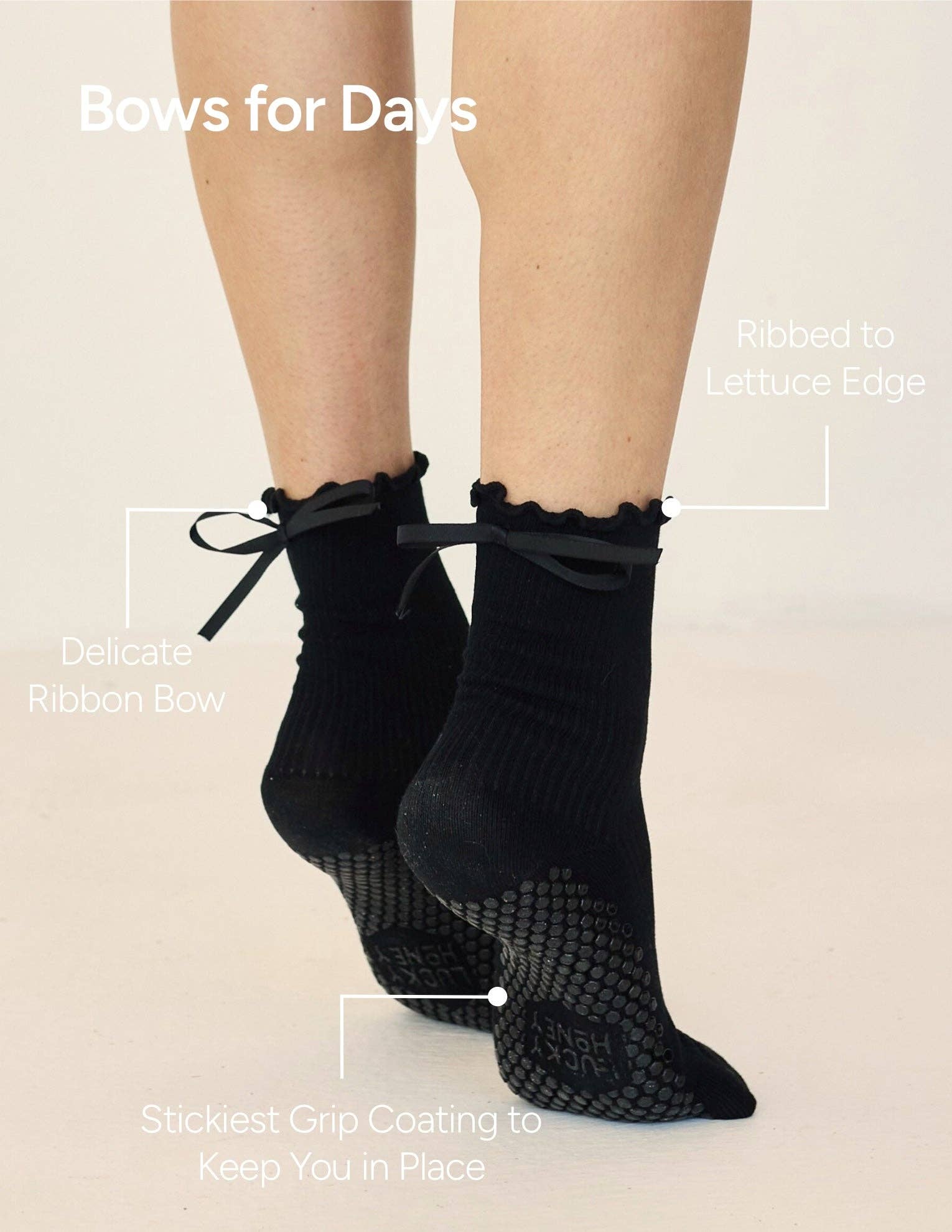The Juliet Grip Sock Our perfectly pretty ribbed ruffle grip sock adorned with a satin bow at back of heel! Your new studio fav! The Features * Extra stick + grip like the honeycomb * Lightweight and breathable CoolMax fabric * Machine washable * Flexibly conforms to all your movements * One size fits all